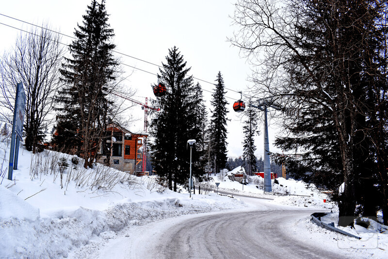 Panoramic view of a ski resort with a snowy slope, lift, road, and surrounding trees. The photo conveys the atmosphere of winter recreation, active sports, and the beauty of snow-covered mountains. Perfect for themes about winter tourism, skiing, and snowy landscapes.